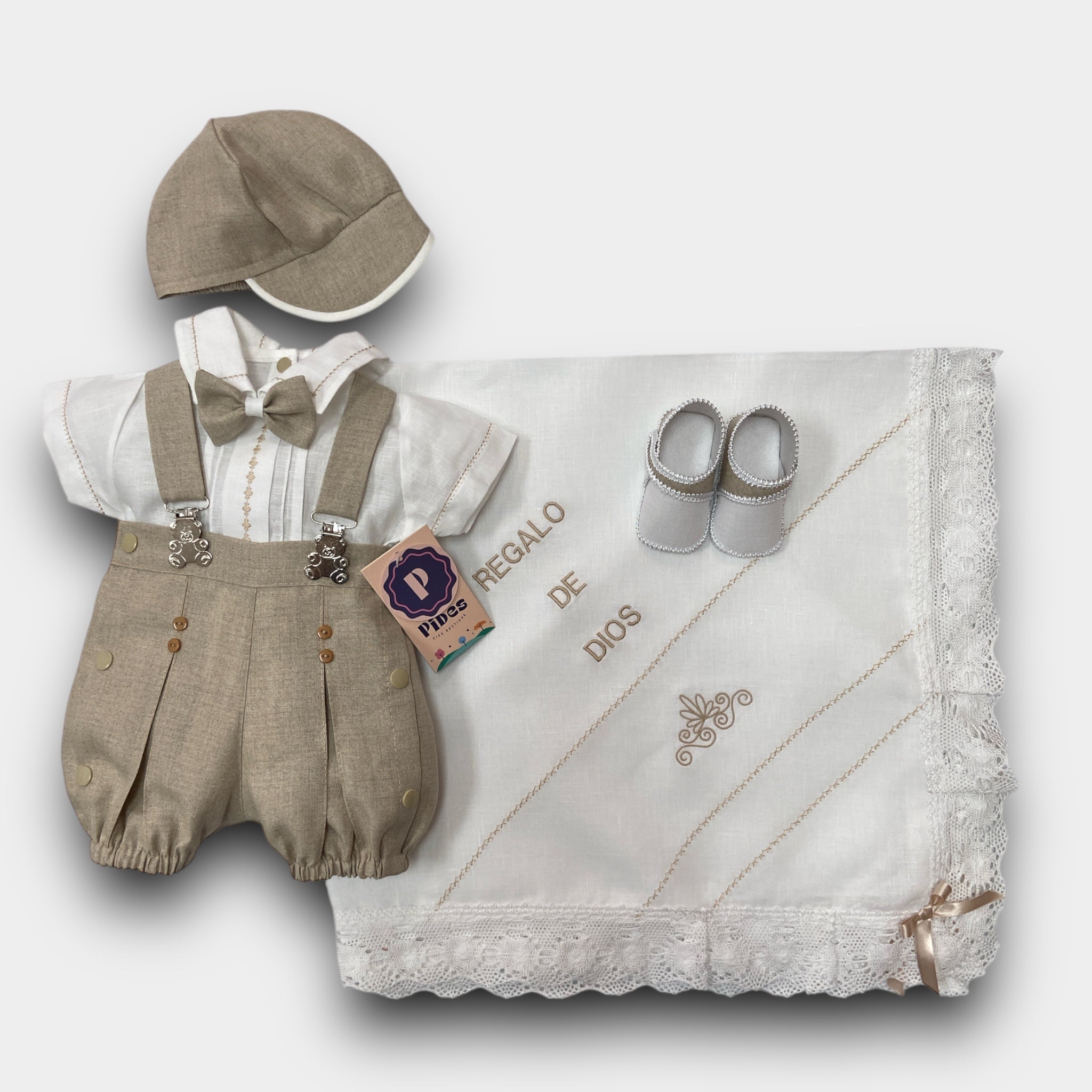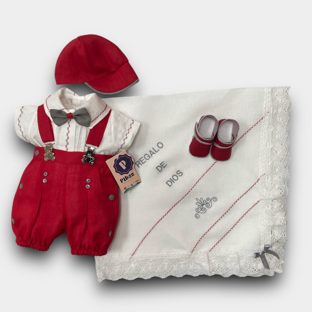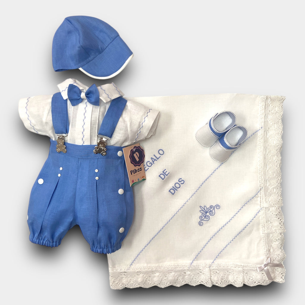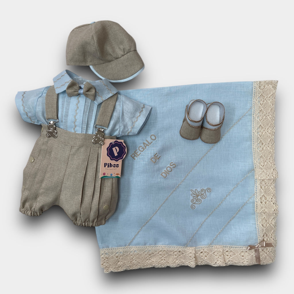 Incluye camIsa , pantalón con manguillos , sabanilla con mundillo Español, gorra y zapatos.