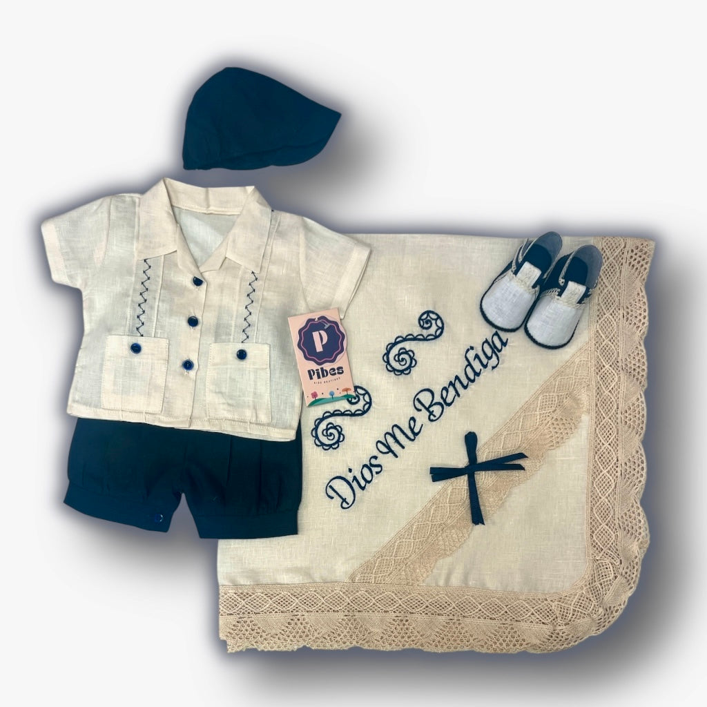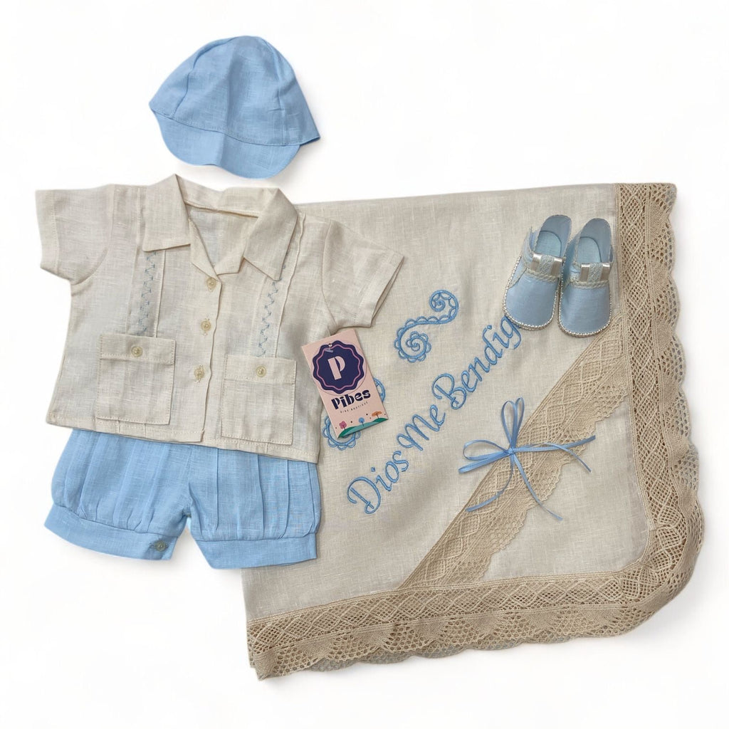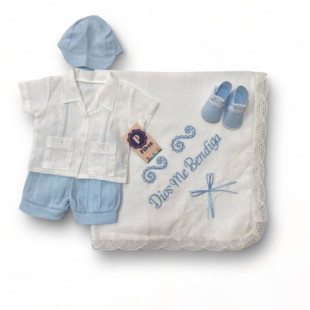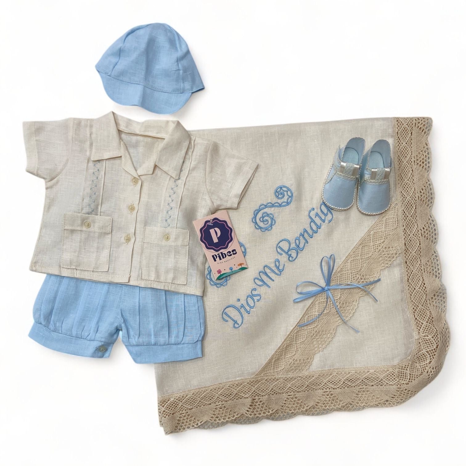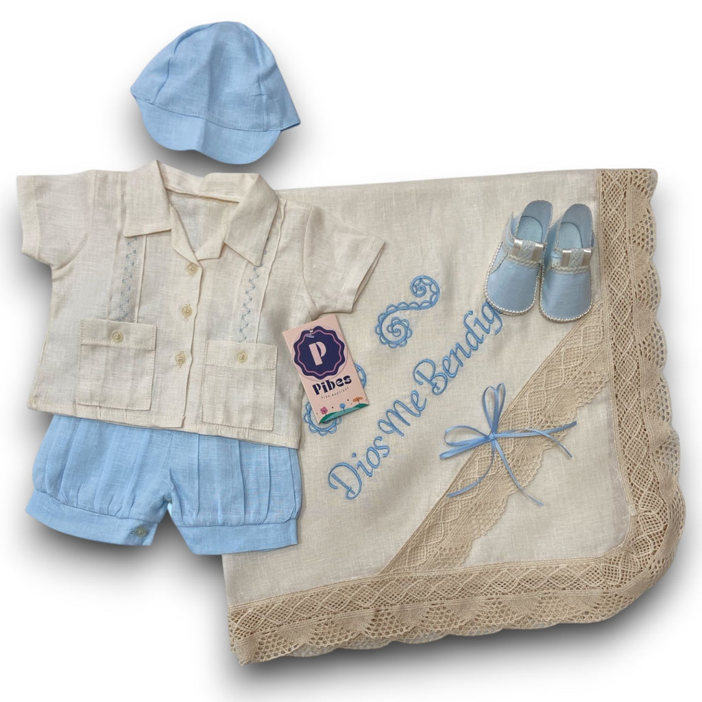 - El set incluye camisa, pantalón, gorra, sabanilla bordada y zapatos.