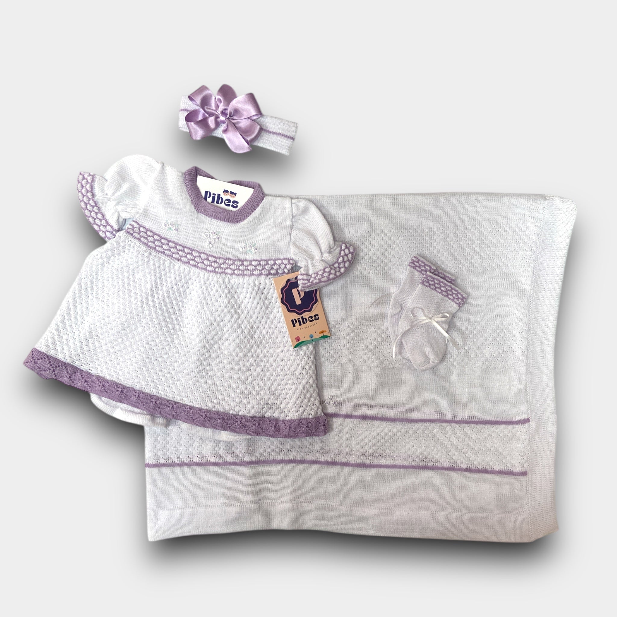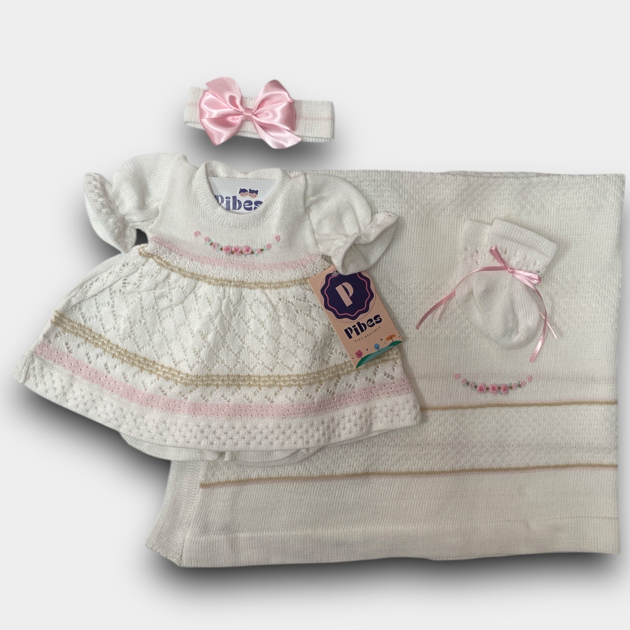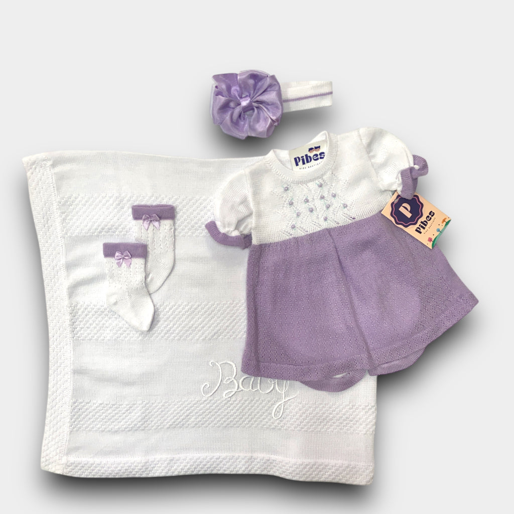 Set de traje tejido con panty, banda con lazo, medias y sabanilla