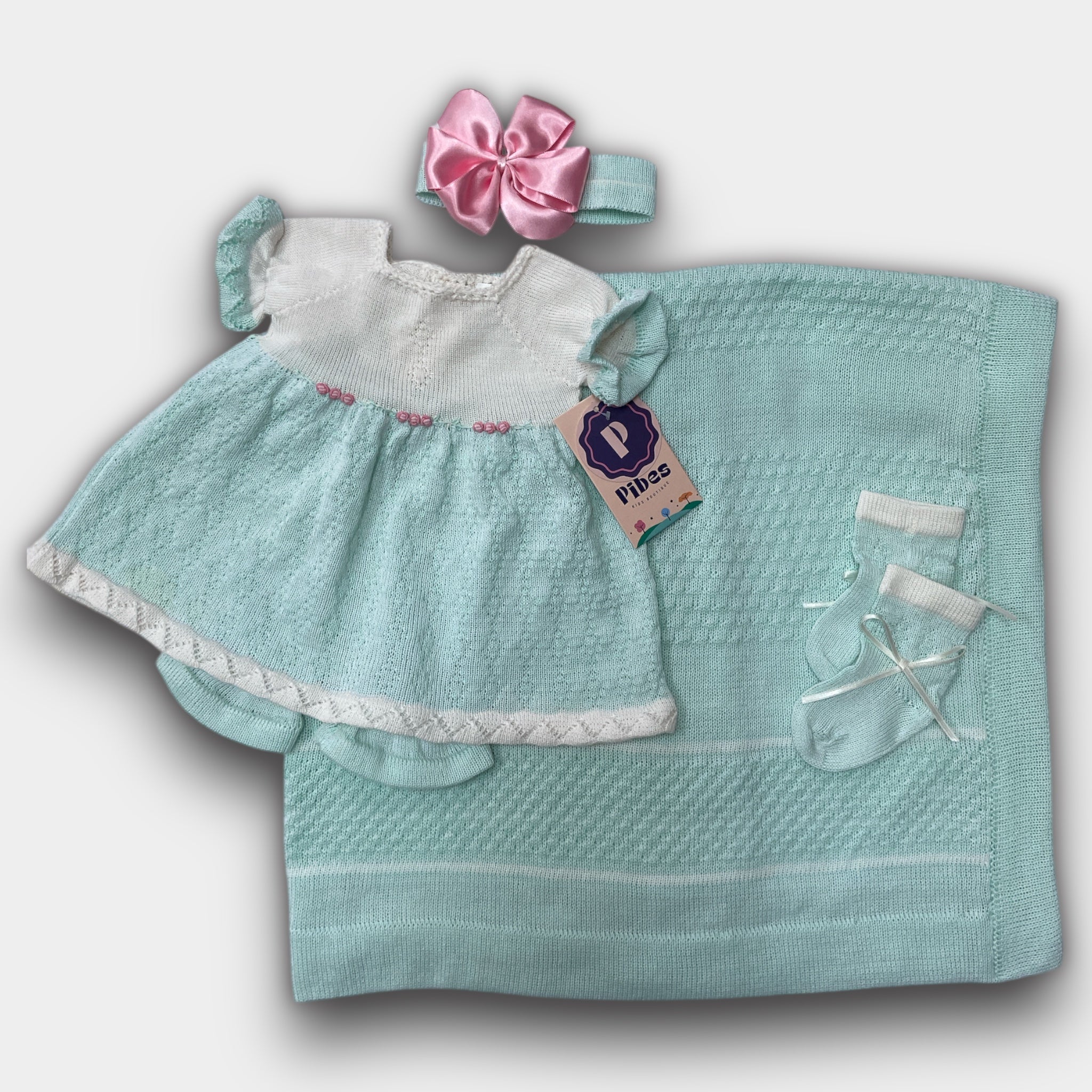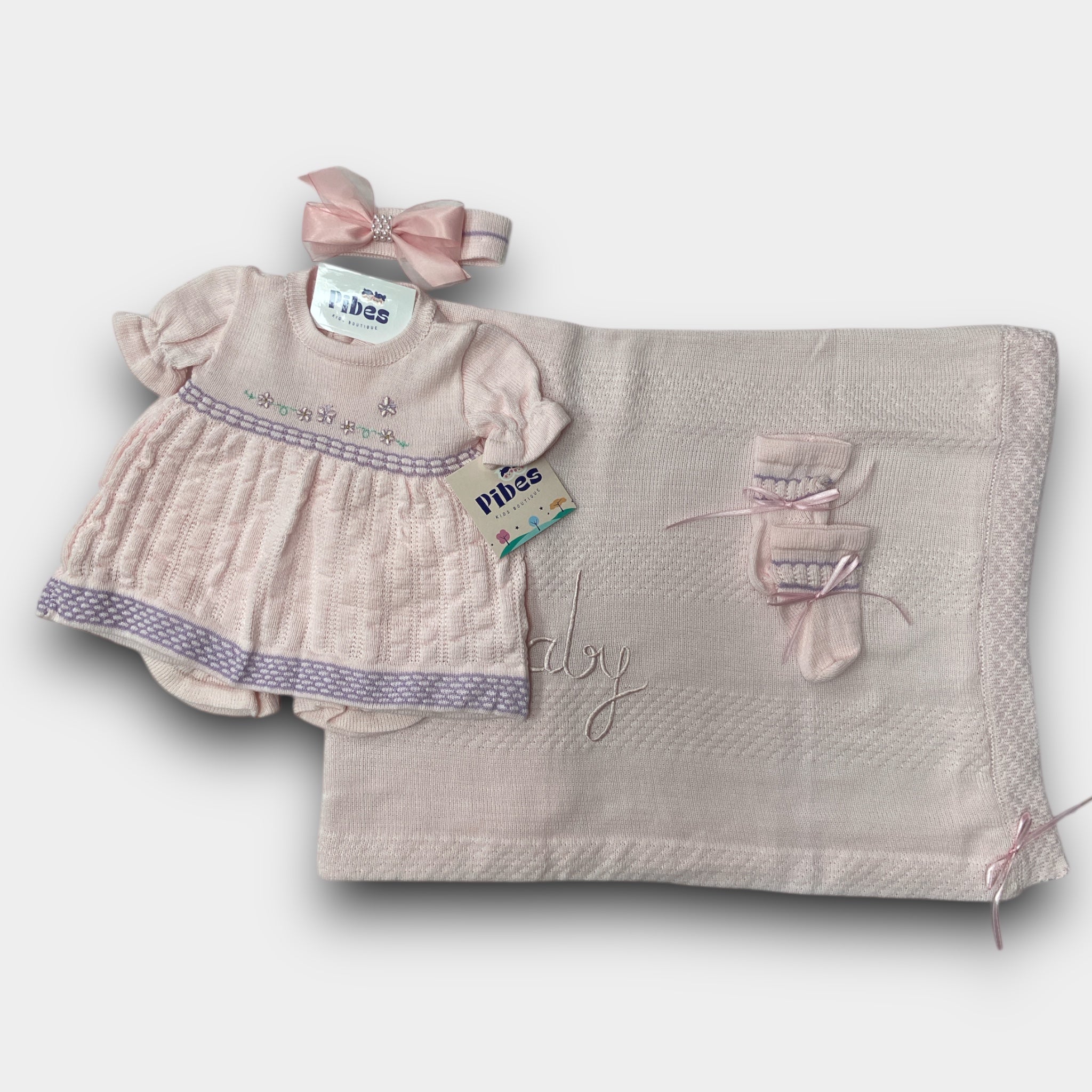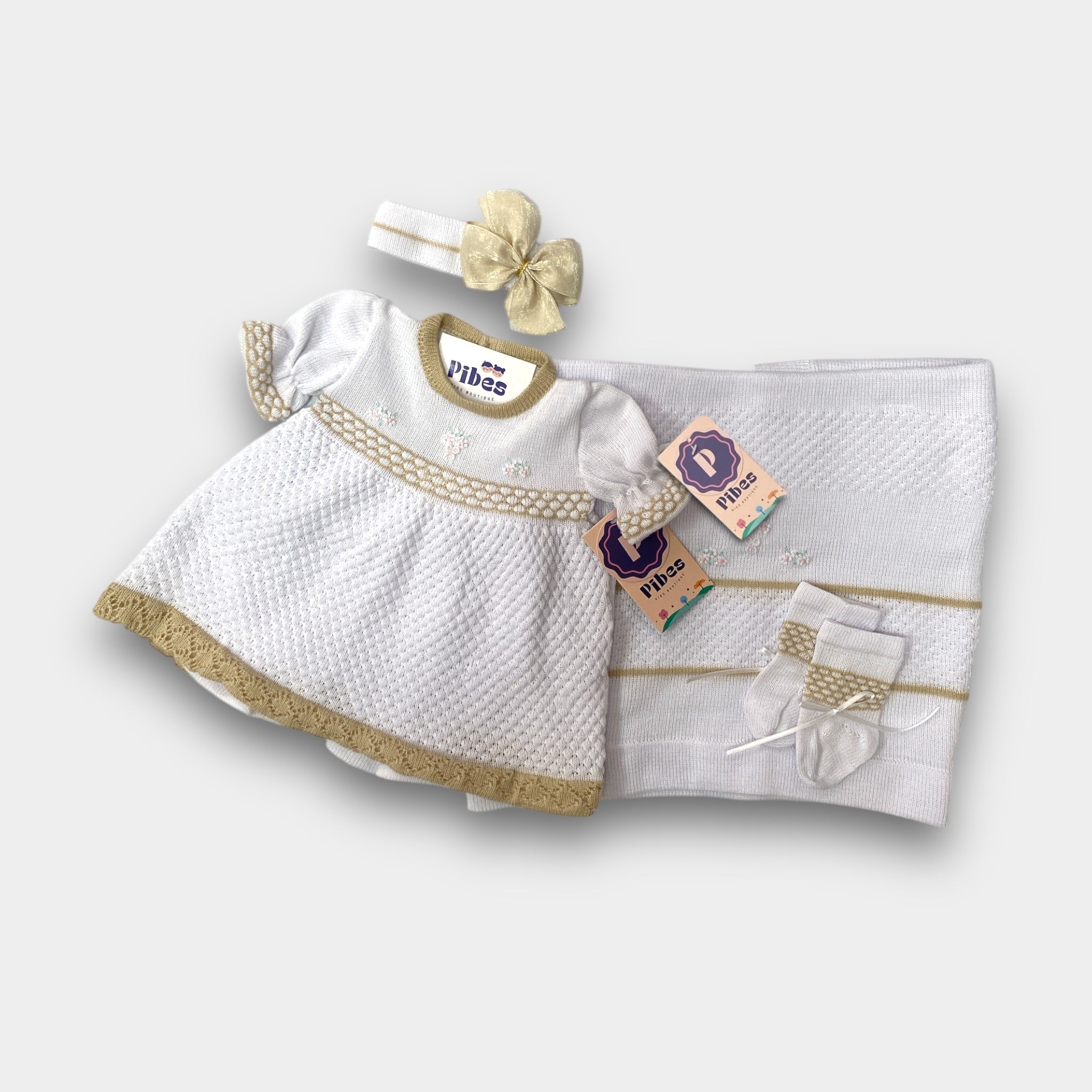 Set de traje tejido con panty, banda con lazo, medias y sabanilla