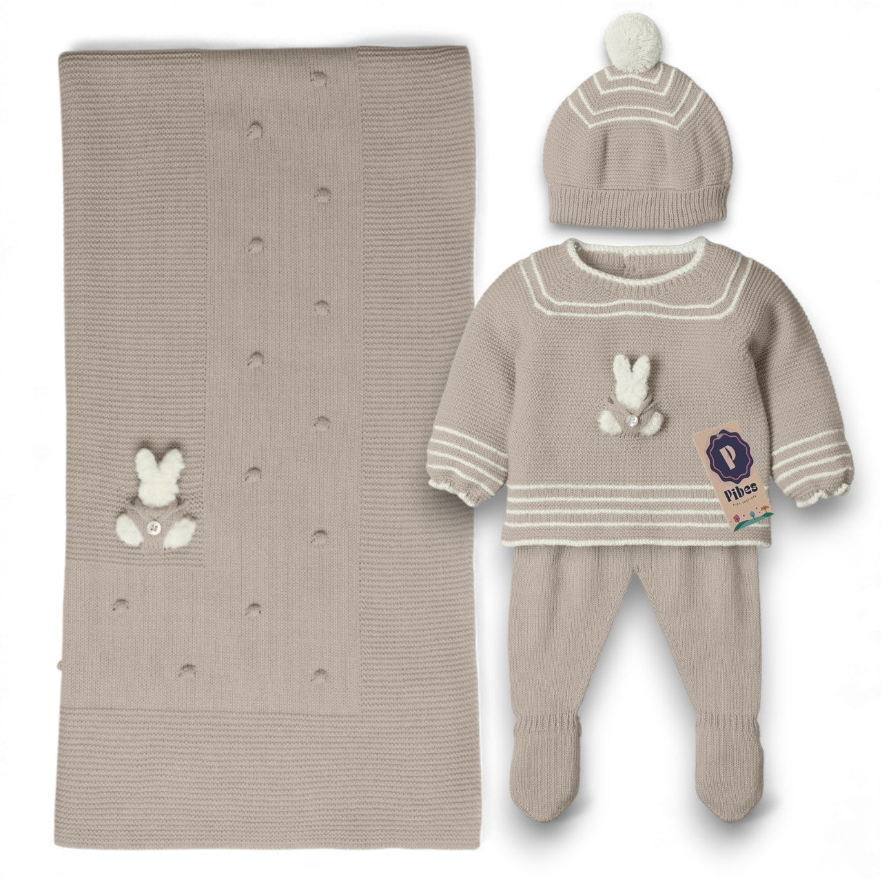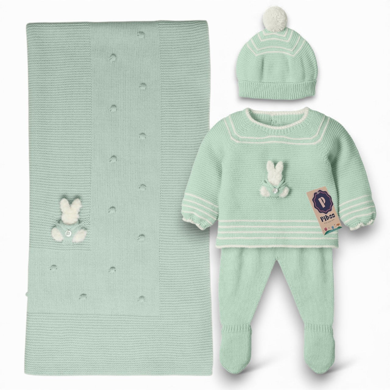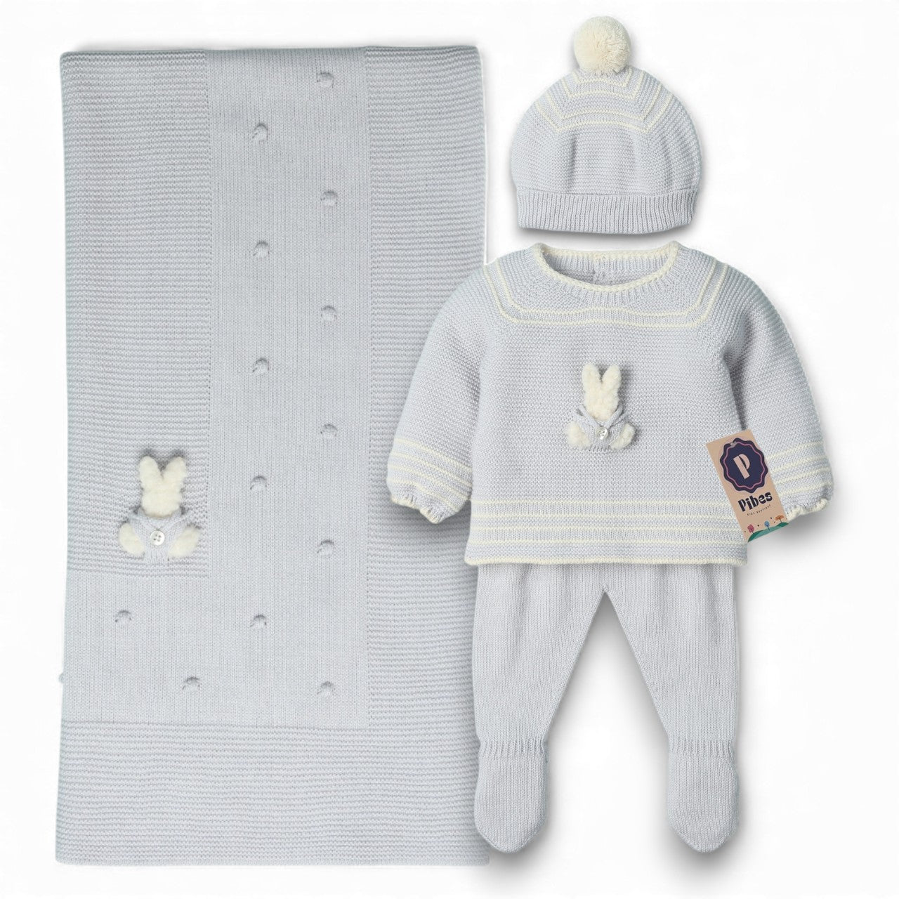 Incluye Camisa de manga larga, pantalón corto, gorro, botines y sabanilla.
