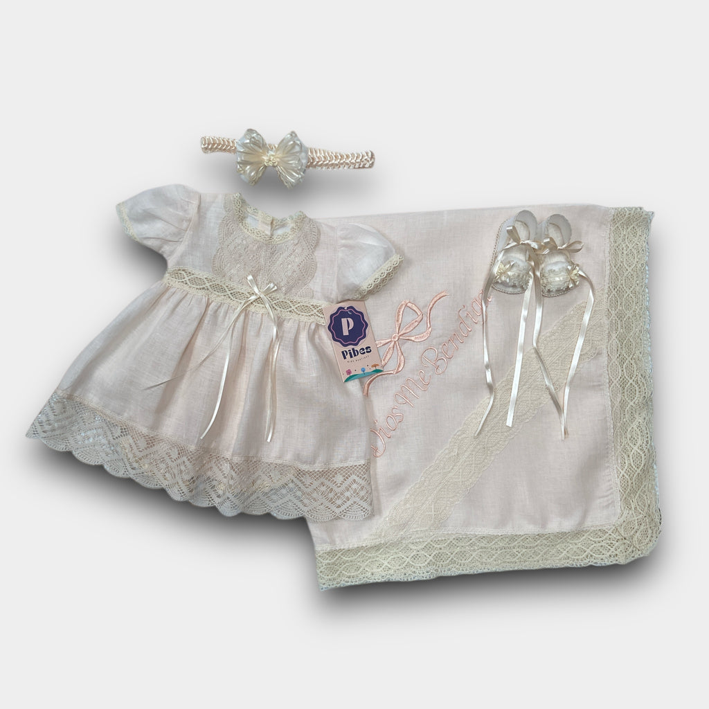 Incluye: Vestido, panty, sabanilla, banda y sandalias.