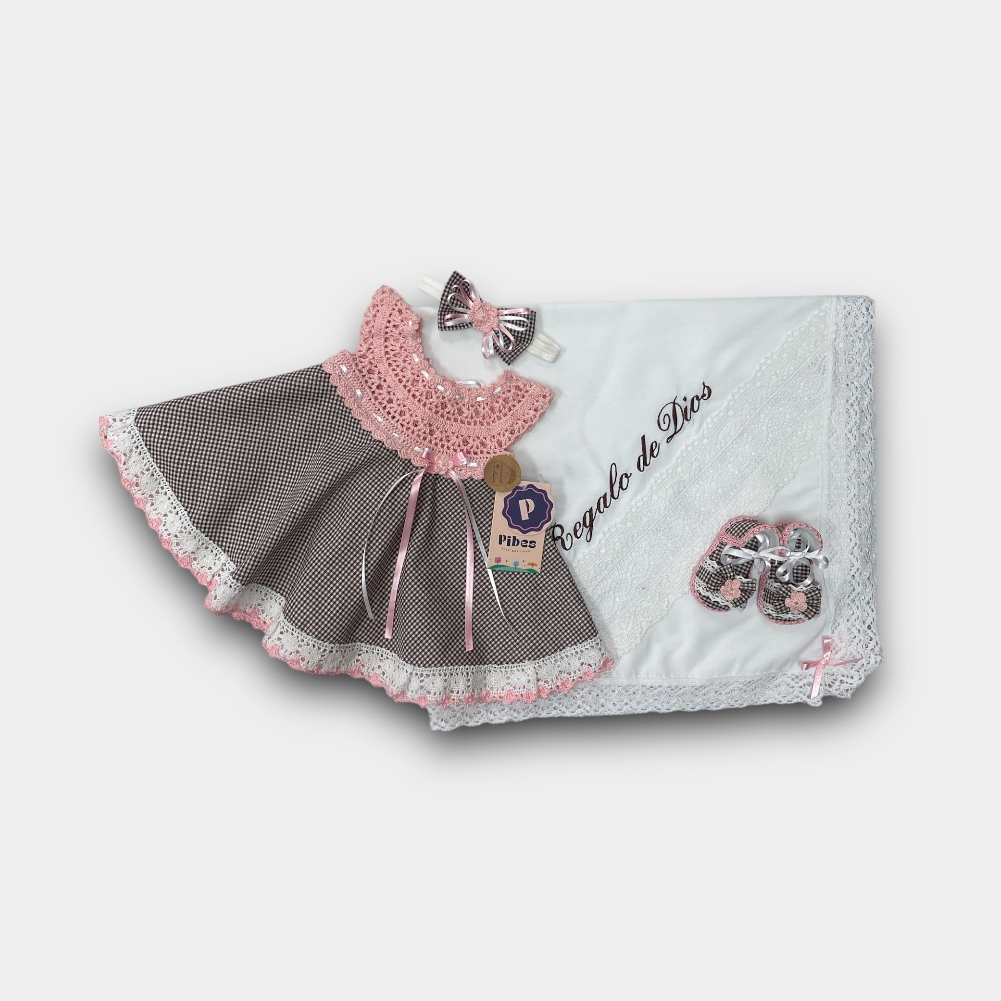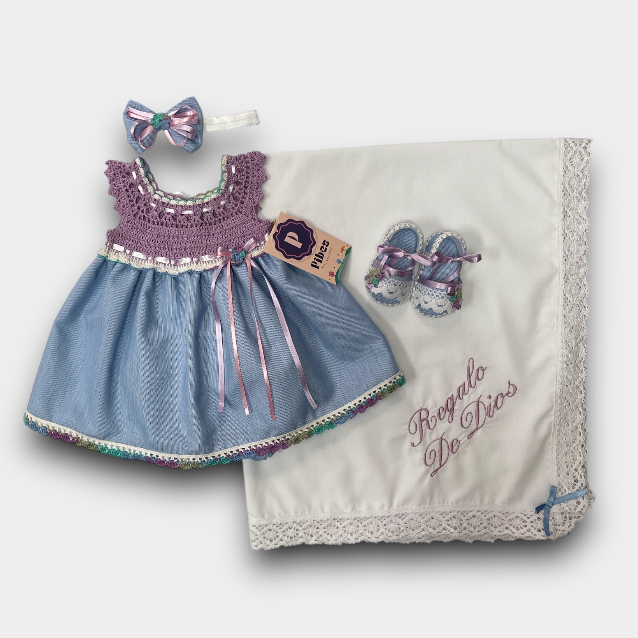 Incluye vestido, pantie, sabanilla, banda con lazo y sandalias.
